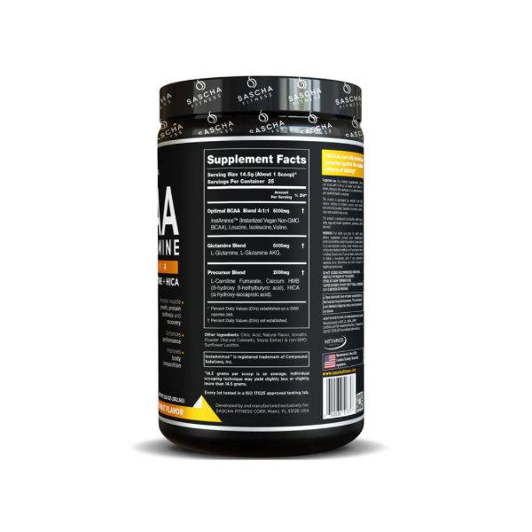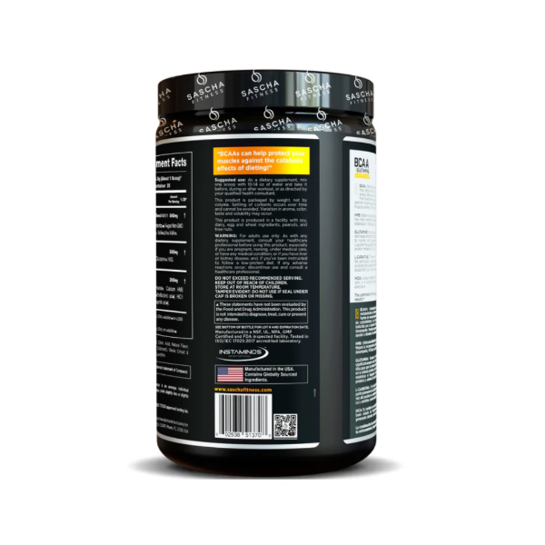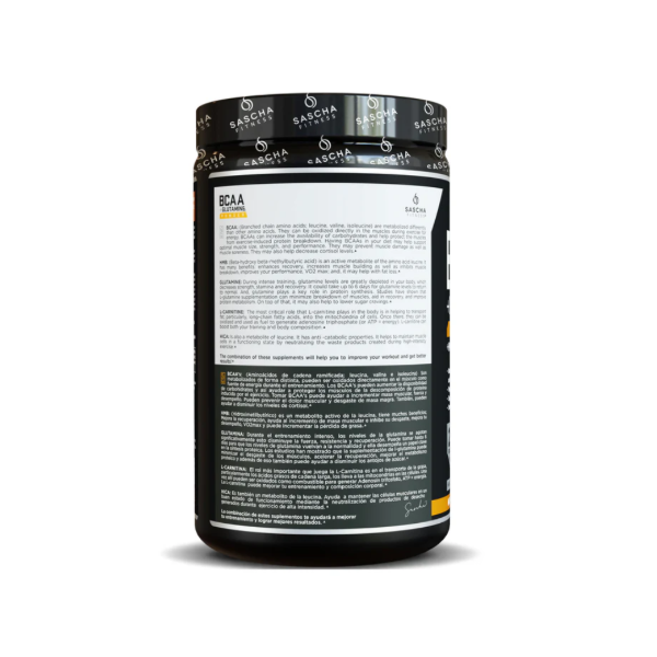 BCAA Sascha Fitness es una combinación de aminoácidos única y poderosa mejora el rendimiento y la recuperación del entrenamiento. Te proporcionará energía limpia y duradera para que puedas superar incluso los ejercicios más agotadores. Se ha formulado con 4:11 BCAA's, Glutamine, HMB, HICA y L-Carnitina.